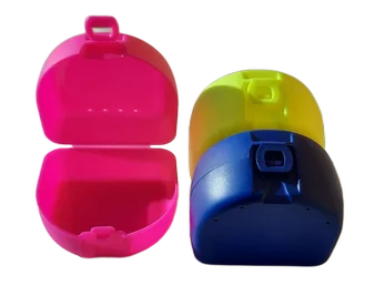 Box costituito da tre pezzi separabili, Base semitrasparente per individuare con uno sguardo il livello dell'acqua- Cestello bianco coprente che non permette di intravvedere eventuali protesi all'interno. Coperchio, Azzurro o Fuxia - Box ideale per la pulizia di apparecchi ortodontici, attivatori , protesi mobili, schermi orali e tettarelle per l'infanzia.